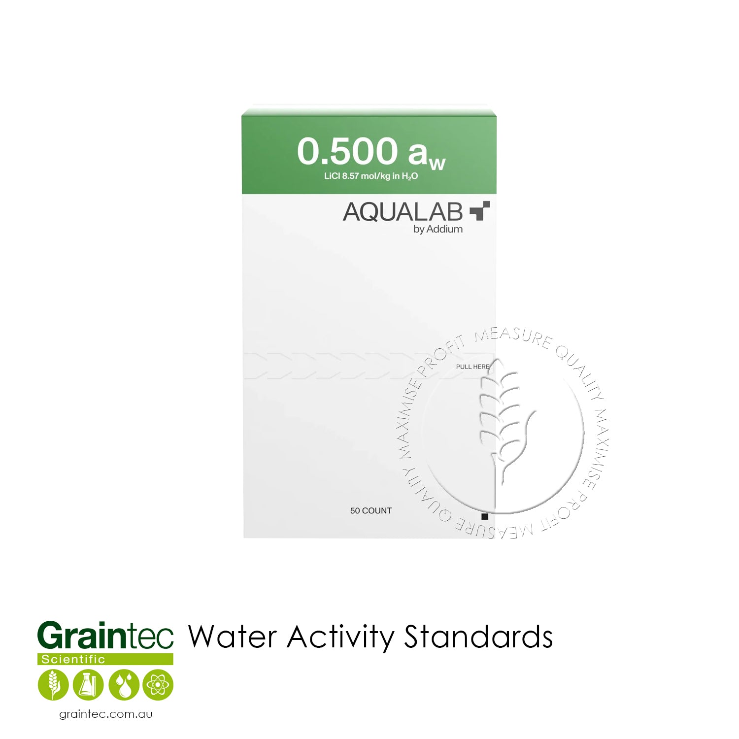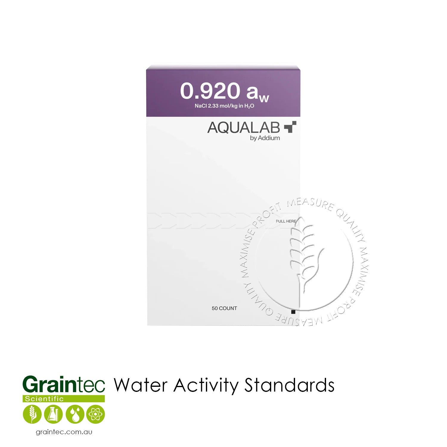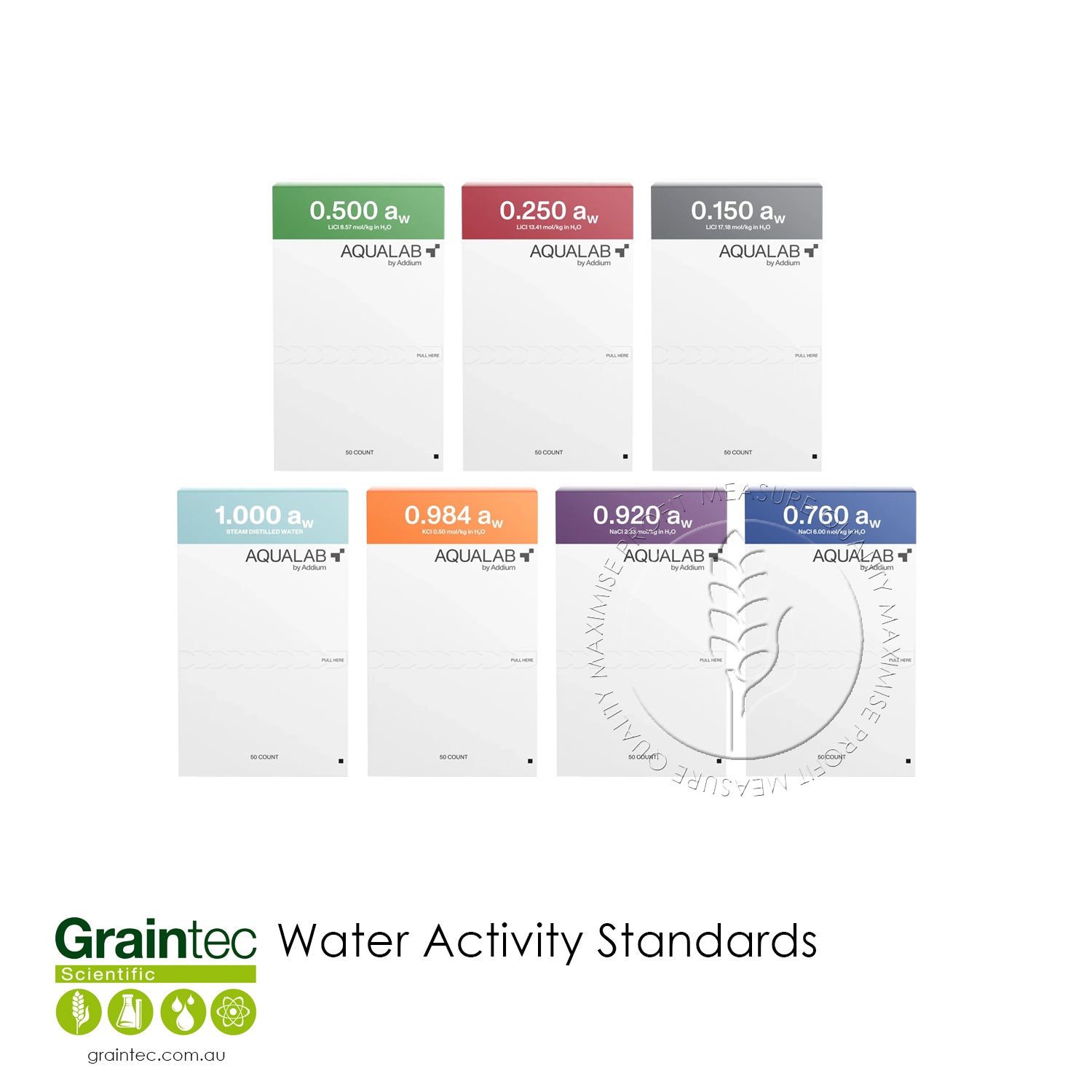 The kit includes 50 disposable vials and offers a wide range of verification points: 0.150, 0.250, 0.500, 0.760, 0.920, 0.984, and 1.000 aw. These cover typical application ranges in food, pharma, and packaging QA.